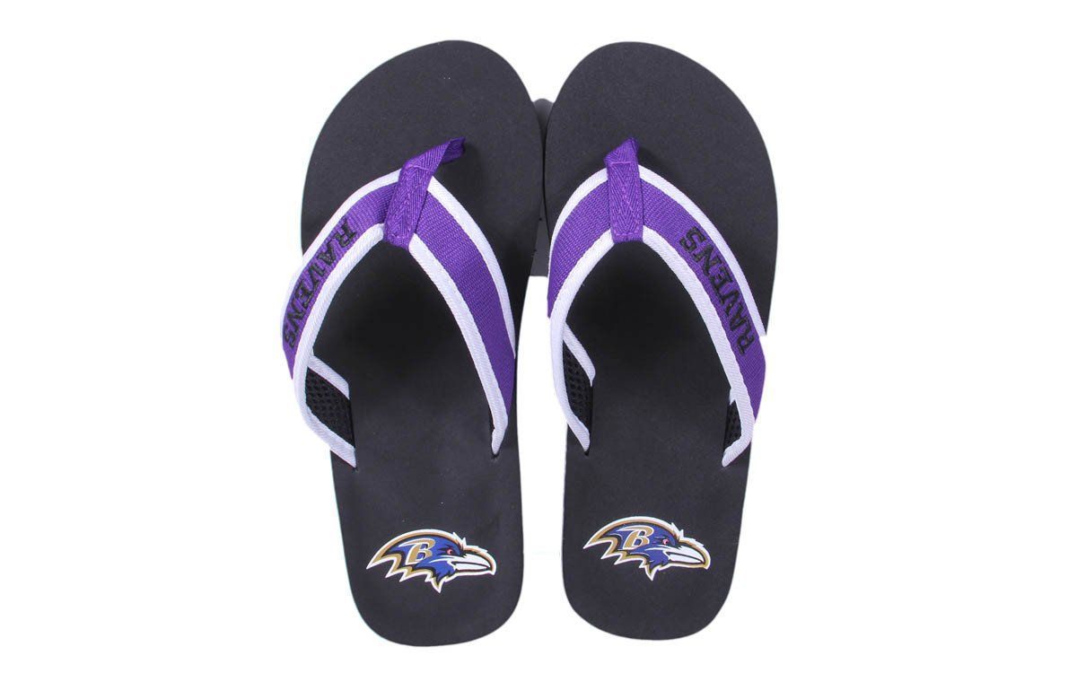 Support your Baltimore Ravens with these unisex Contour Flip Flops. These flip flops come in the team colors and include the Ravens team logo.