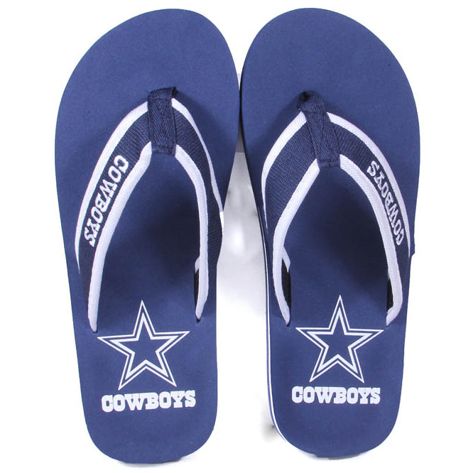 Support your Dallas Cowboys with these unisex Contour Flip Flops. These flip flops come in Black and Blue team colors and include a Navy blue star with white and navy blue outlines. Makes the perfect gift!