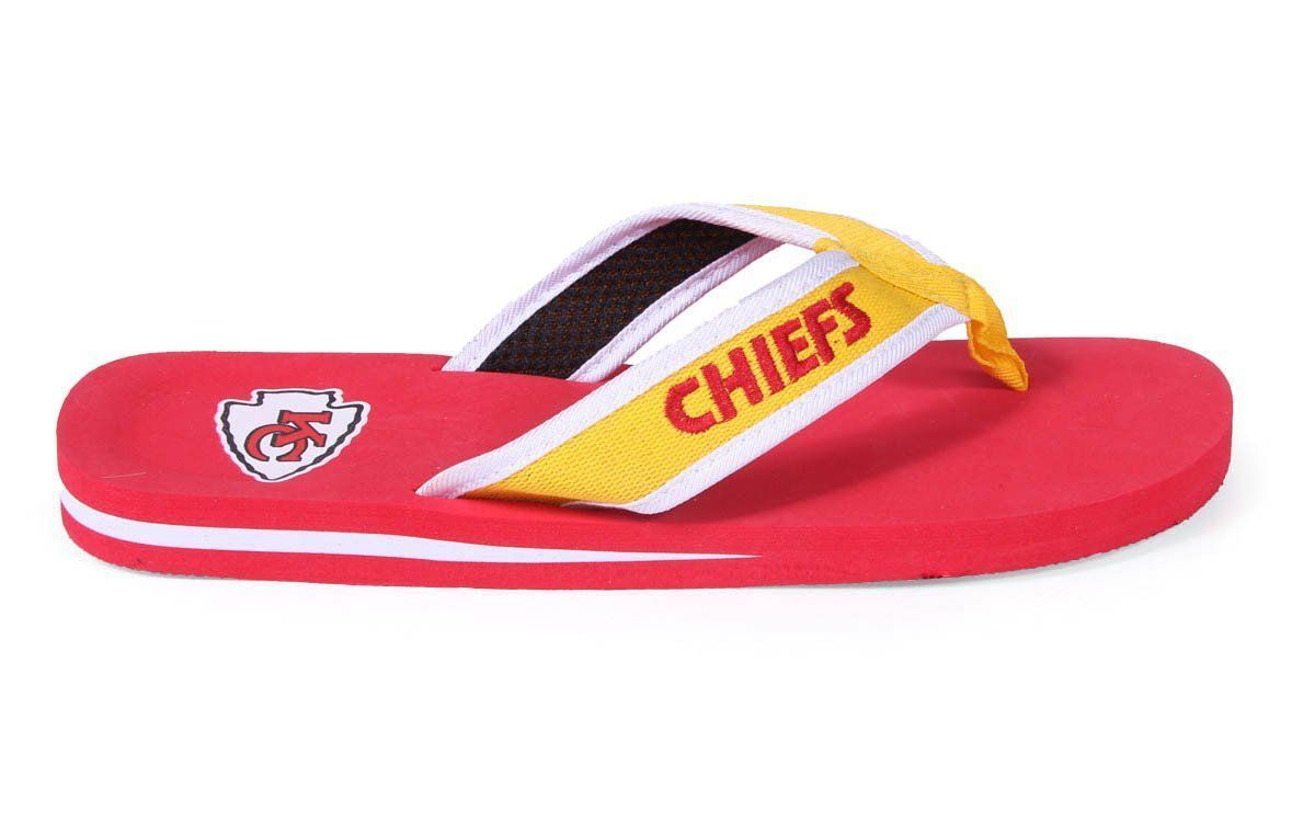 Support your Kansas City Chiefs with these unisex Contour Flip Flops. These flip flops come in Red and Gold team colors and include the Interlocking KC in an arrowhead Chiefs logo. Makes the perfect gift!