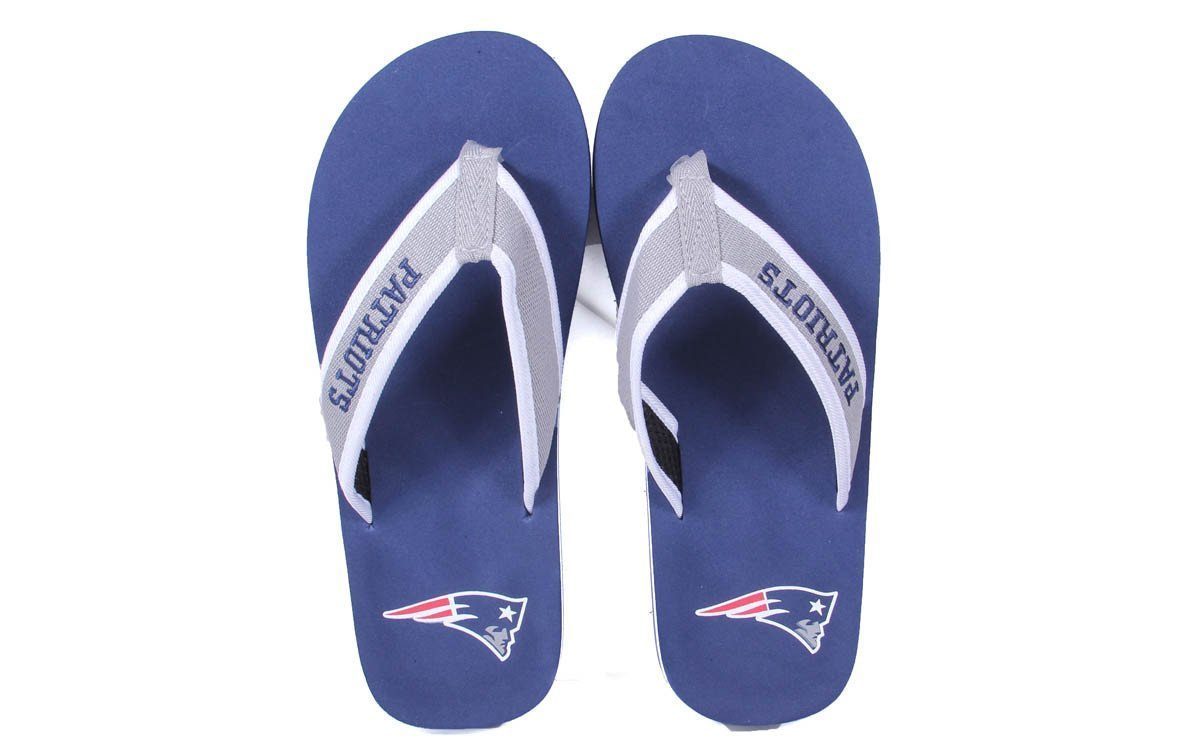 Support your New England Patriots with these unisex Contour Flip Flops. These flip flops come in Blue and Silver team colors and include a Silver patriot with navy hat, white star and red stripes team logo. Makes the perfect gift! Bottom made of a super soft 100% EVA. Comfortable Nylon and Jersey material with Team Name Embroidered make up the straps.