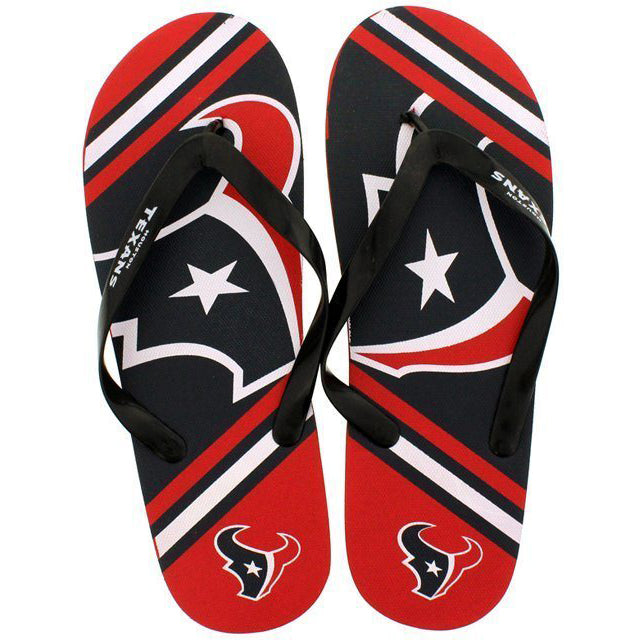 Support your Houston Texans with these unisex Big Logo Flip Flops. These flip flops come in Red and Blue team colors and include the Texans team logo, A midnight blue and red bull with a white star as an eye! Makes the perfect gift!