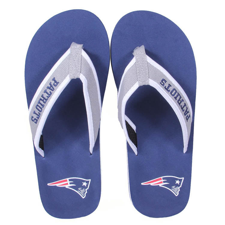 Support your New England Patriots with these unisex Contour Flip Flops. These flip flops come in Blue and Silver team colors and include a Silver patriot with navy hat, white star and red stripes team logo. Makes the perfect gift! Bottom made of a super soft 100% EVA. Comfortable Nylon and Jersey material with Team Name Embroidered make up the straps.