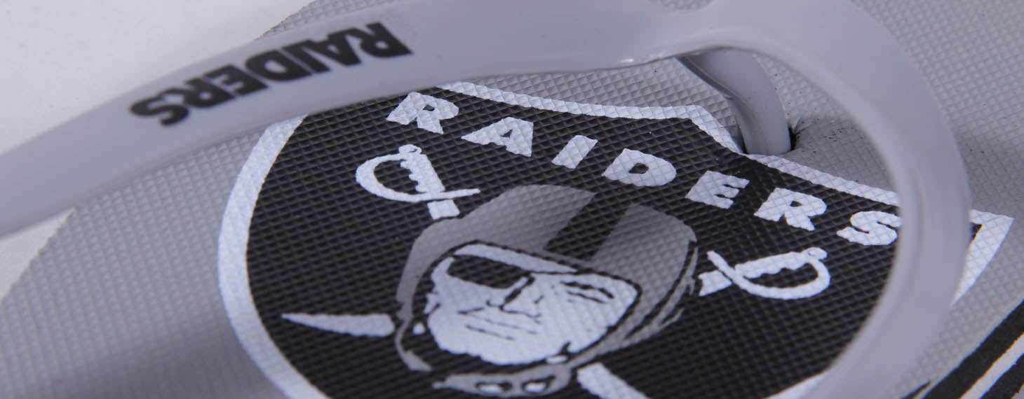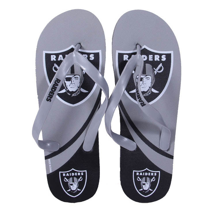 Support your Oakland Raiders with these unisex Big Logo Flip Flops. These flip flops come in Black and Silver team colors and includes the Raider Head in front of Crossed Swords logo. Makes the perfect gift!
