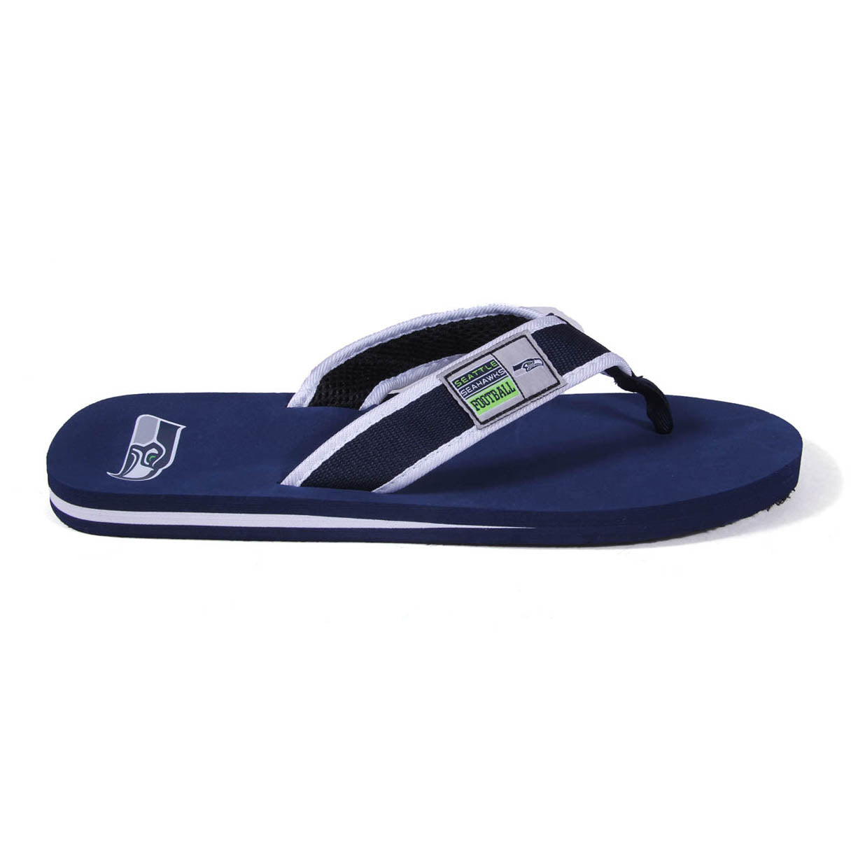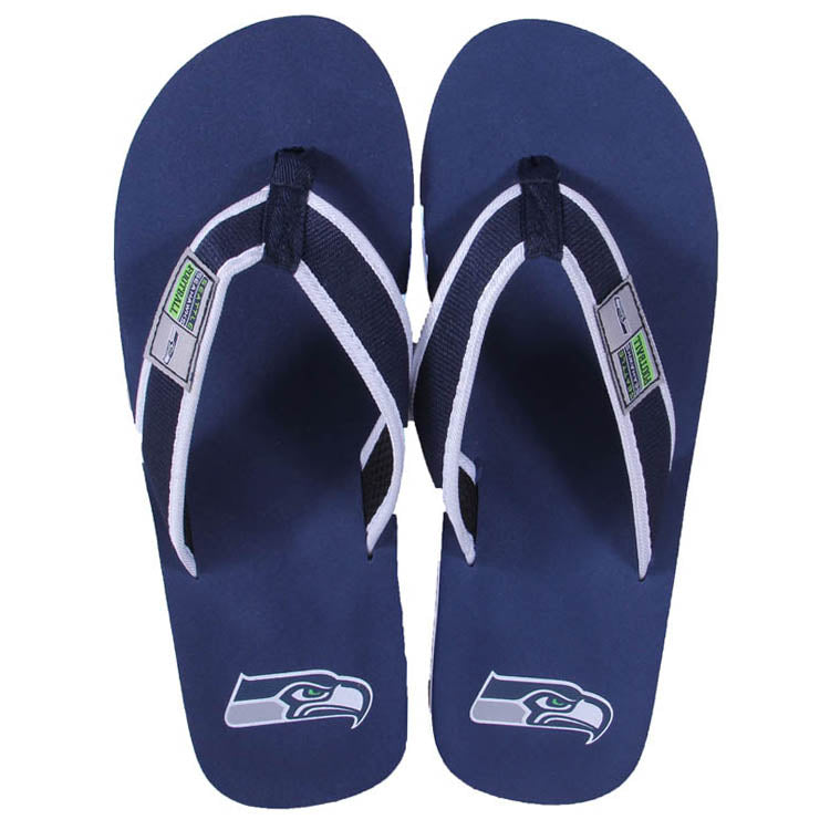 Support your Seattle Seahawks with these unisex Contour Flip Flops. These flip flops come in Blue and Silver team colors and includes a Hawk head with green eye in navy blue and silver logo. Makes the perfect gift! Bottom made of a super soft 100% EVA. Comfortable Nylon and Jersey material with Team Name Embroidered make up the straps.