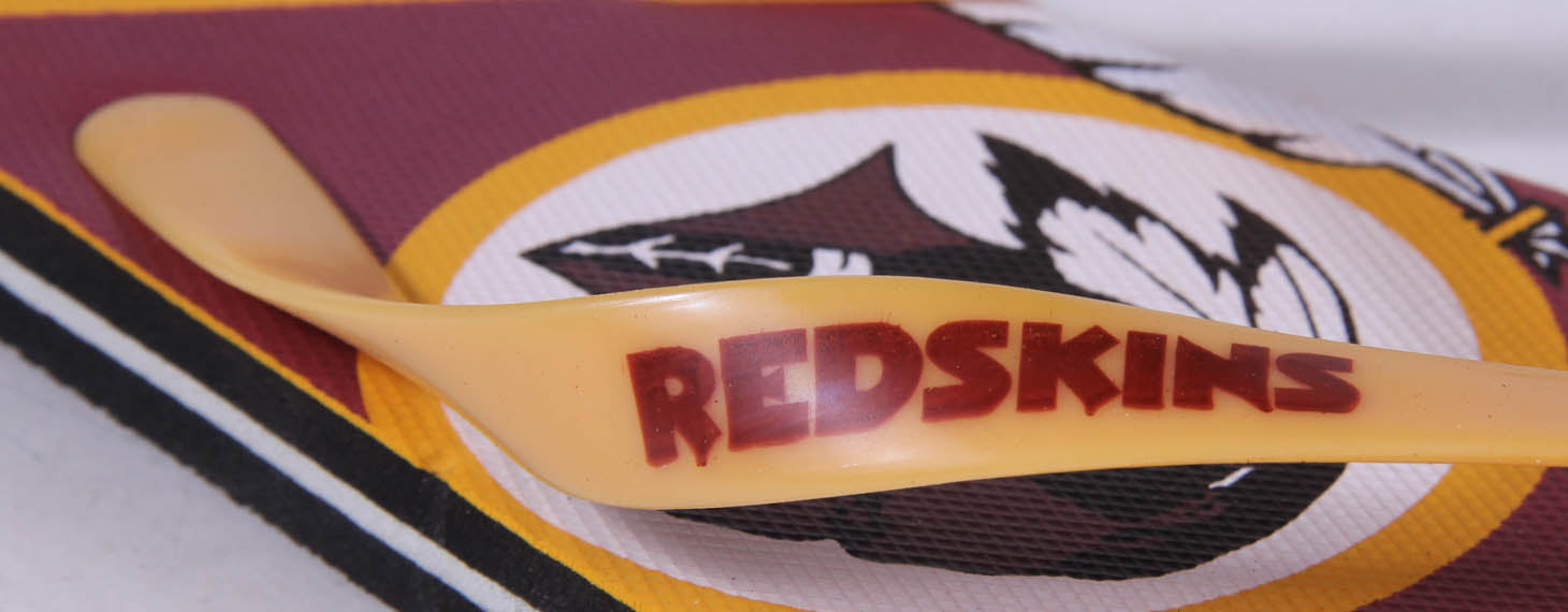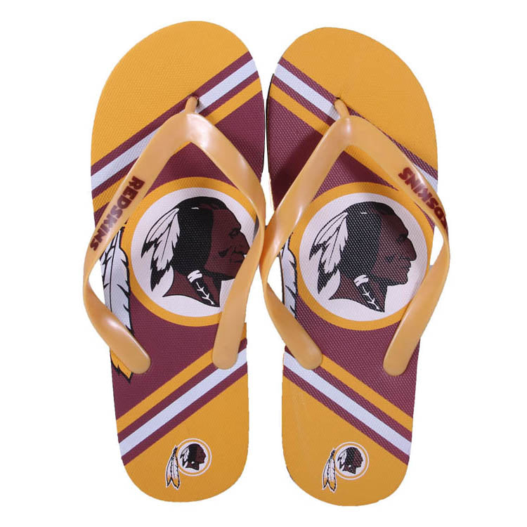 Support your Washington Redskins with these unisex Big Logo Flip Flops. These flip flops come in Red and Gold team colors and include the Native American head inside yellow circle with hanging feathers logo. Makes the perfect gift!