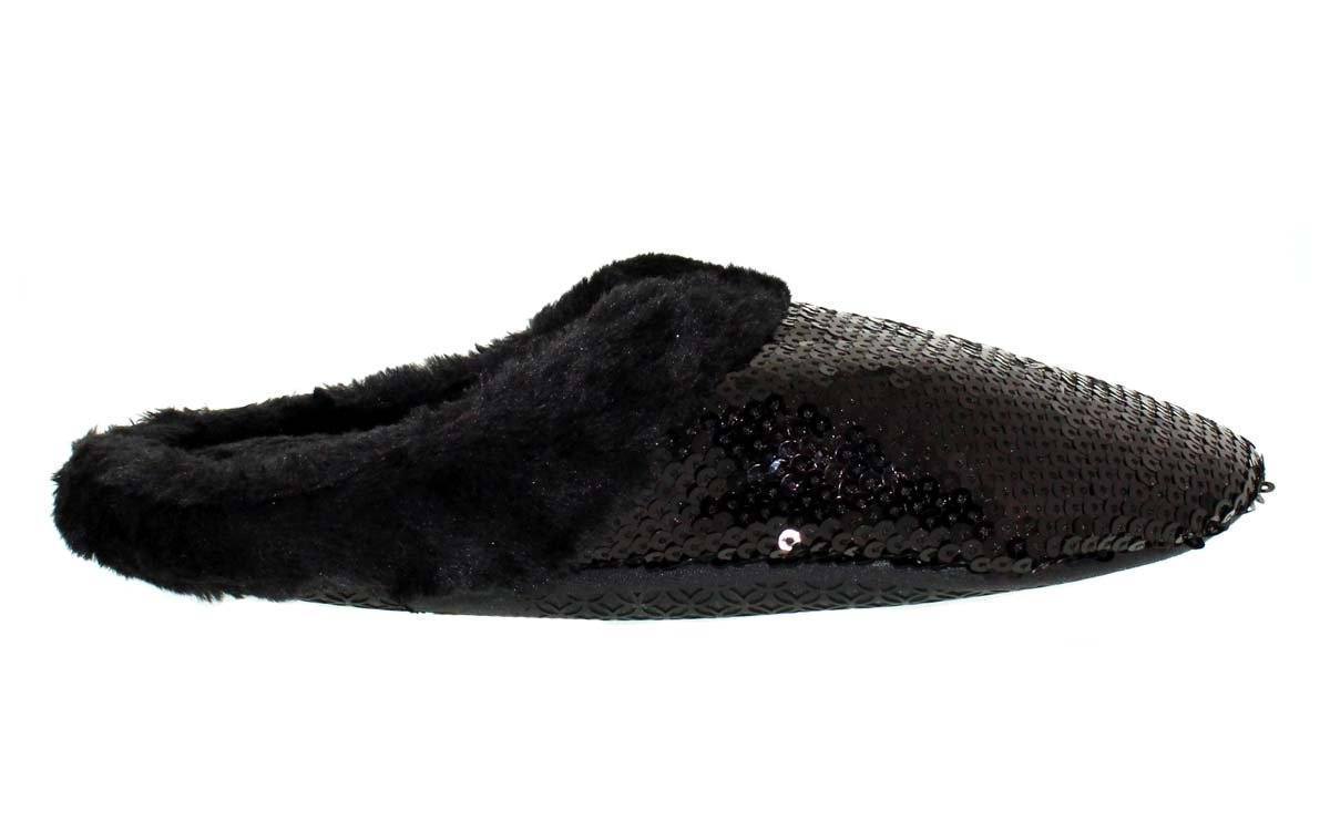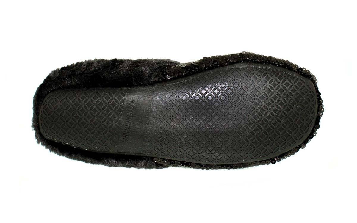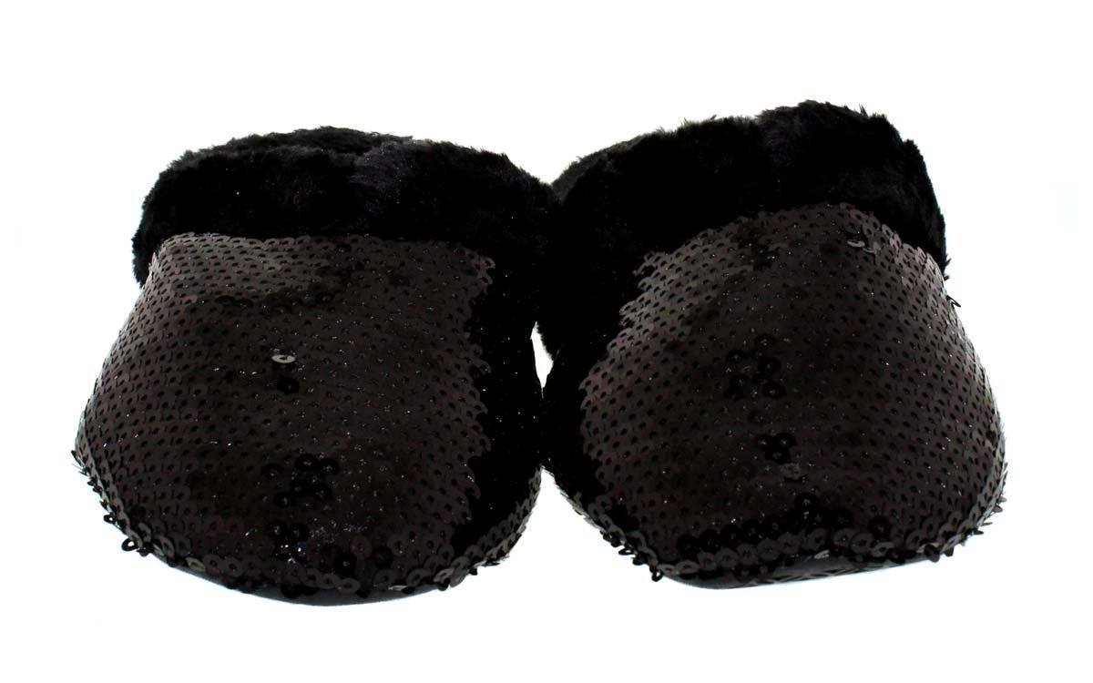 Black sequin covered outer with soft black plush inner and accent collar over soft TPR padded sole. 100% polyester upper