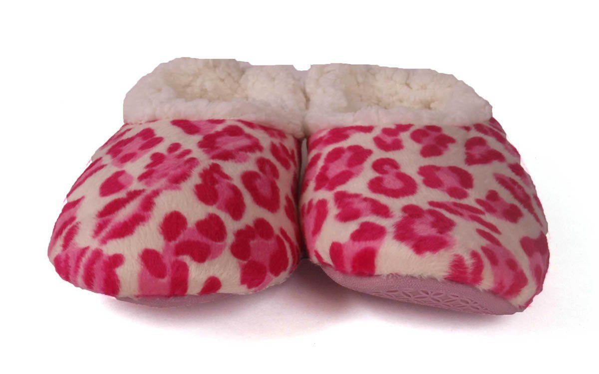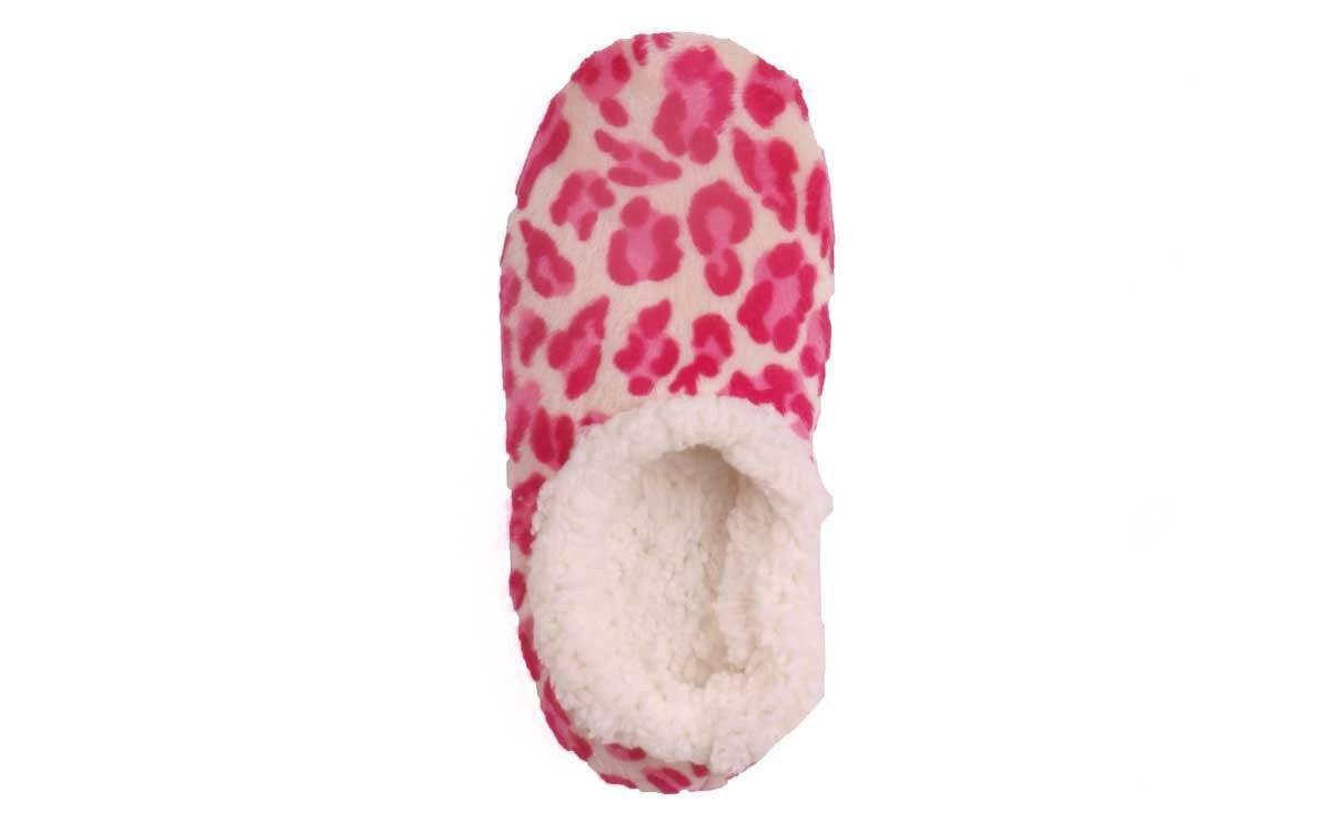 Brushed pink leopard print fleece outside with soft white Sherpa fabric inside on a padded sole and non skid TPR bottom, 100% polyester upper