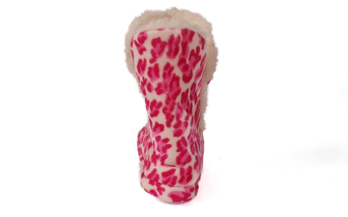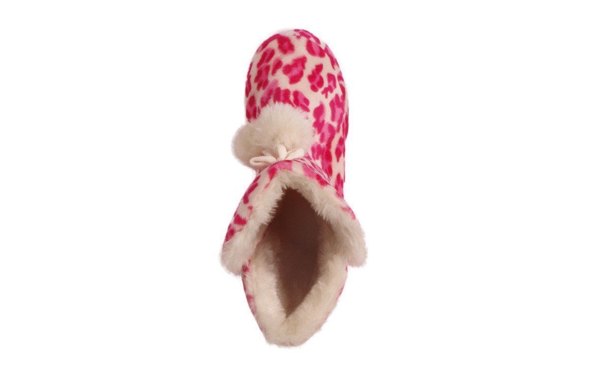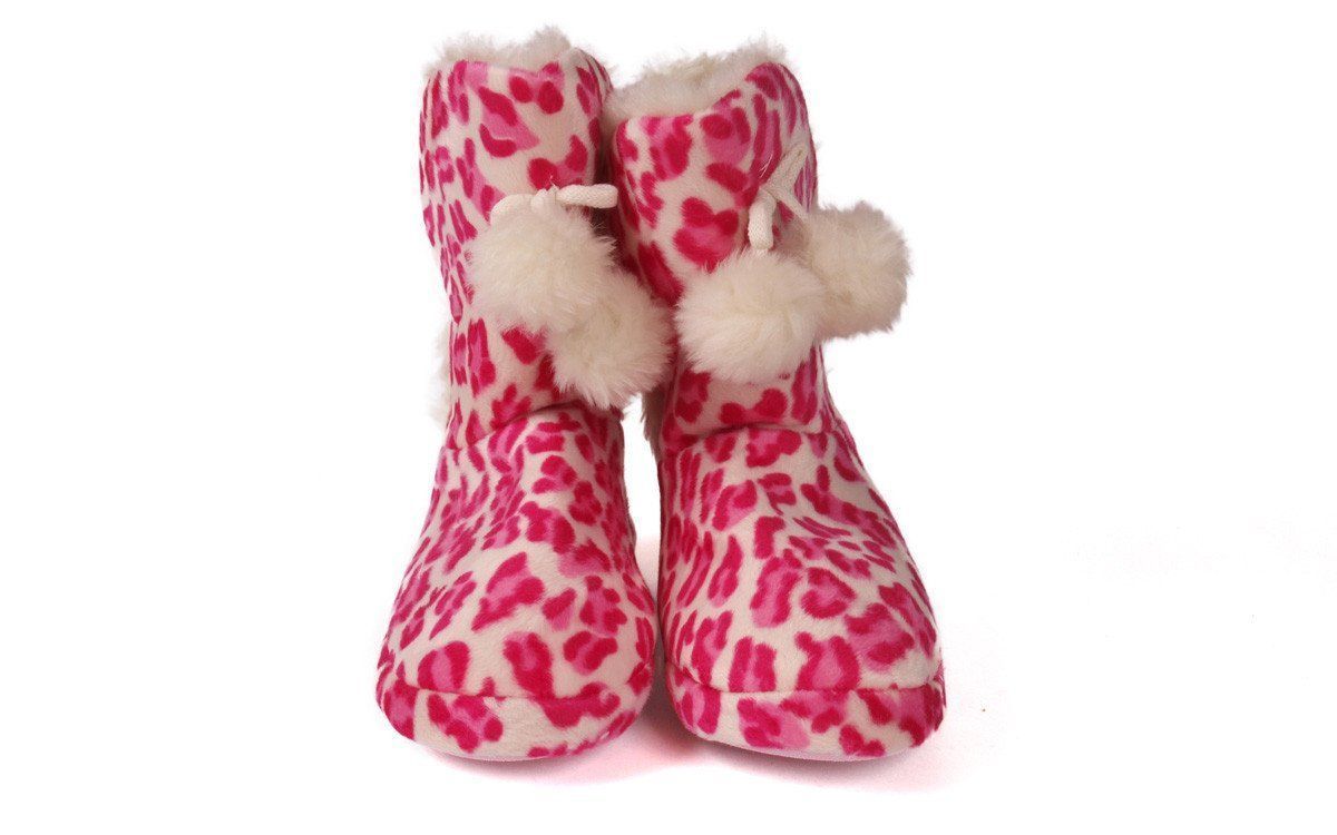 Pink leopard print moccasin boot with TPR bottom and 100% polyester upper. Pink leopard print on white with white faux fur lining, accent trim and pompoms
